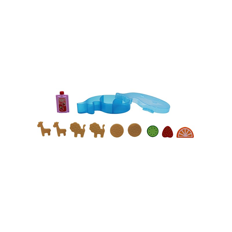 The lunch box contains 10 pcs. play food including funny animal shaped crackers and a bottle.