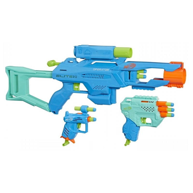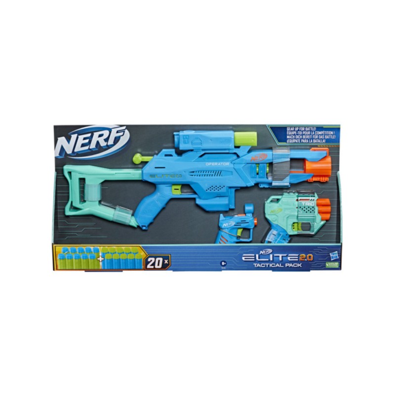 Get ready for battle with this 3-blaster set: The Nerf Elite 2.0 Tactical Pack includes 3 Nerf Elite 2.0 Blasters and 20 Nerf Elite darts!