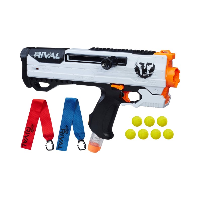 The blaster includes an easy-to-load magazine with 7 rounds and 7 high-impact rounds. This Nerf Rival blaster also features a trigger lock and tactical rail.