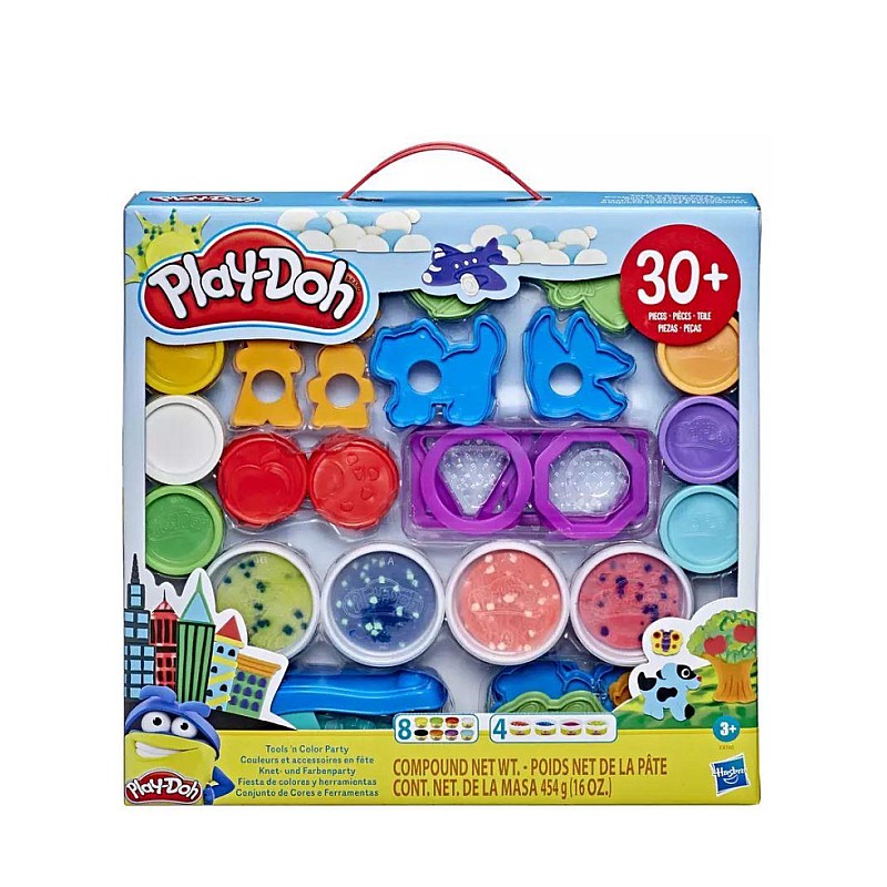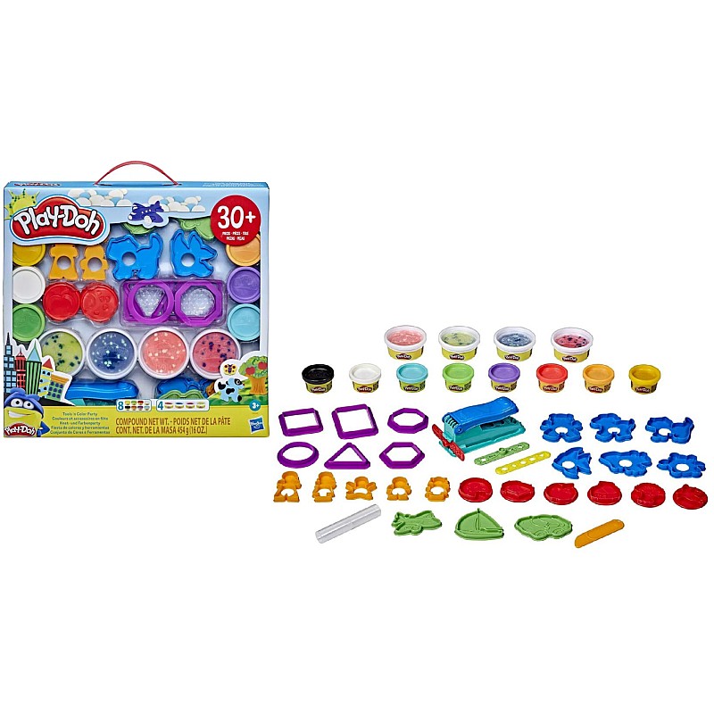 The package includes: 8 small tubes of classic color, 4 boxes of Play-Doh Color Burst and over 30 cool plasticine tools.