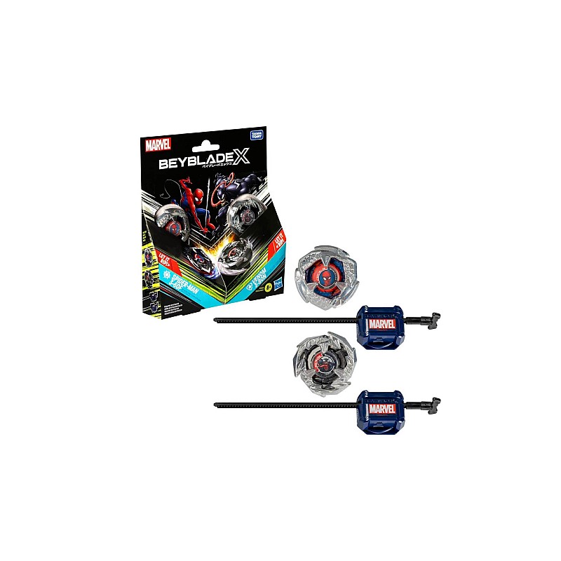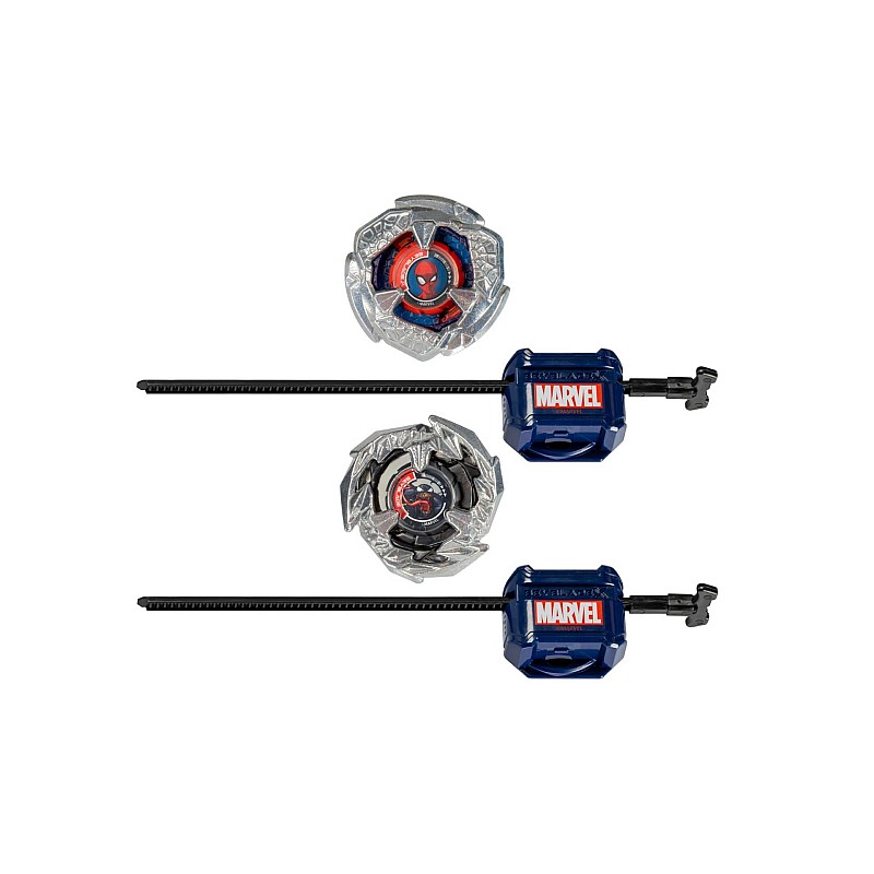 Includes 2 beyblade x tops designed by Takara Tomy with authentic cast metal parts: Spider-Man 3-60F attack with straight rotation and 3-80n defense type with straight rotation with an attack type blade; and 2 launchers.