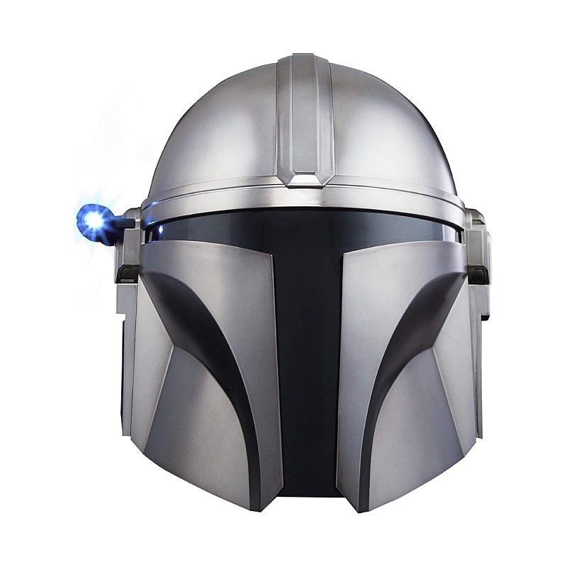 The design includes intricate detailing that mirrors the helmet worn by the character Din Djarin, with a glossy silver finish and a distinctive T-shaped visor.