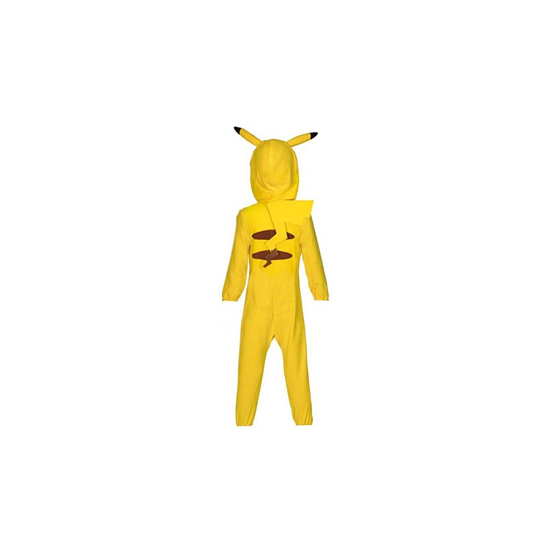 The Pokemon Pikachu costume for children includes a yellow jumpsuit with a front zipper, a detachable tail and a hood with attached ears.