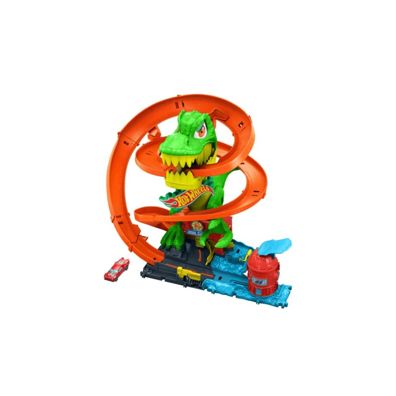 He faces a hungry T-Rex who attacked the Hot Wheels City fire station with a 1:64 scale toy car!