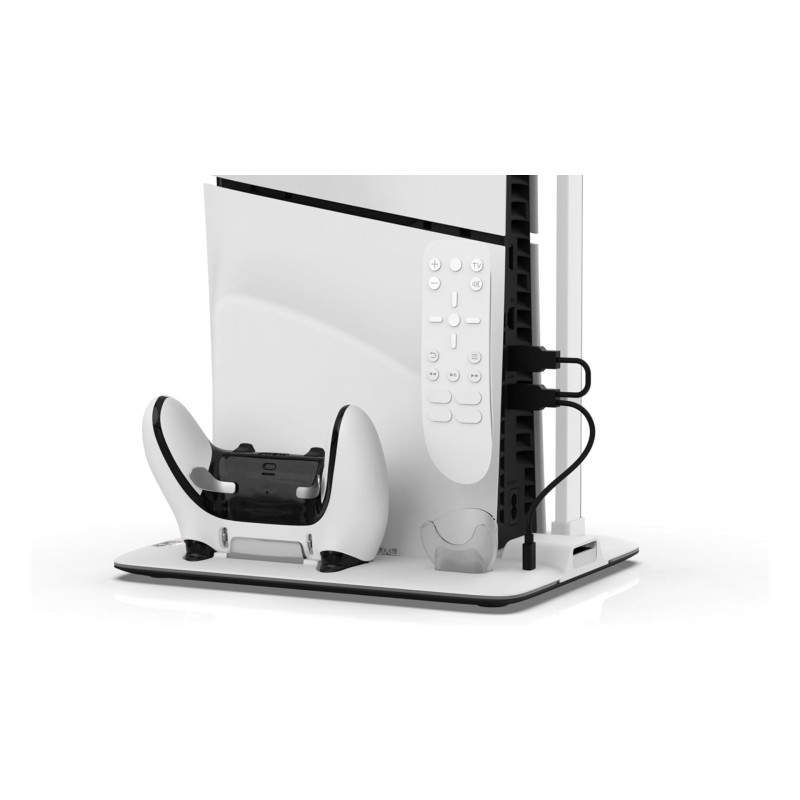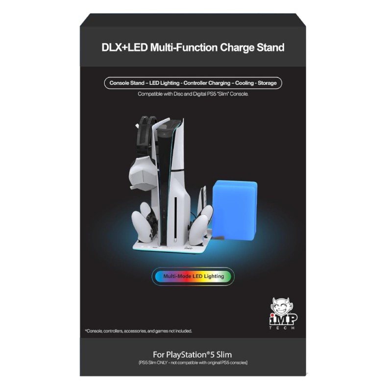 Multi-functional PS5 DLX+ LED multi-function stand for charging, cooling and storage with ambient LED lighting.