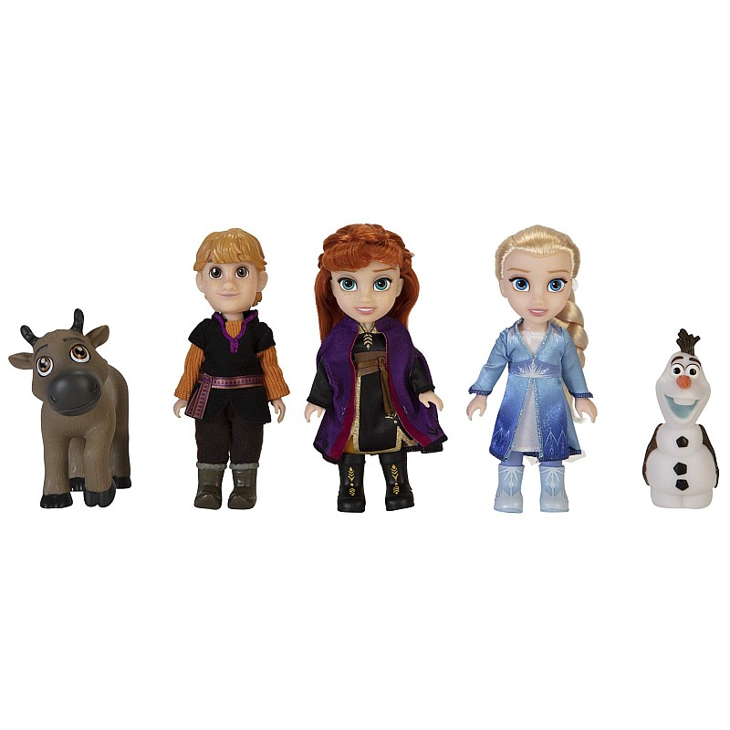 Includes: Anna doll, Elsa doll, Kristoff doll, Olaf, Sven, 3 doll outfits, 3 pairs of doll boots.