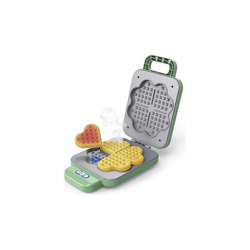 The waffle maker set consists of a waffle iron with lights and sounds for realistic play, 4 waffle parts, plate, juice glass and jam bottle.