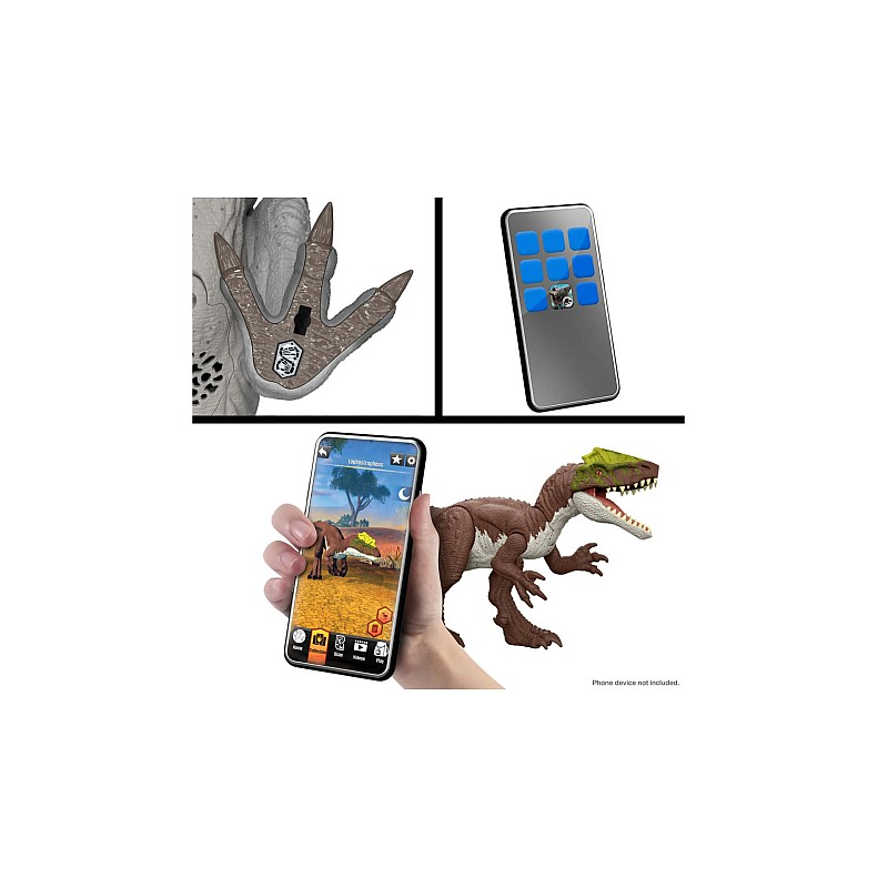 Scan the tracking code on the dinosaur's leg with the free Jurassic World Play app on a compatible device (Android or iOS, not included) to access a digital version of the dinosaur and play its fun and deadly racing game against various vehicles on land, air and water. Colors and patterns may vary.