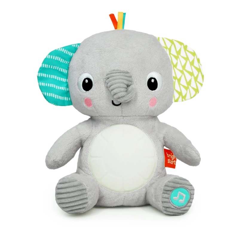 The soft elephant plush toy plays 20+ minutes of soothing melodies and lights with a gentle tap of its foot.