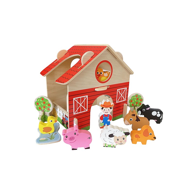 The charming Krea farm set in vivid colors with a red barn and 11 fun wooden figures.