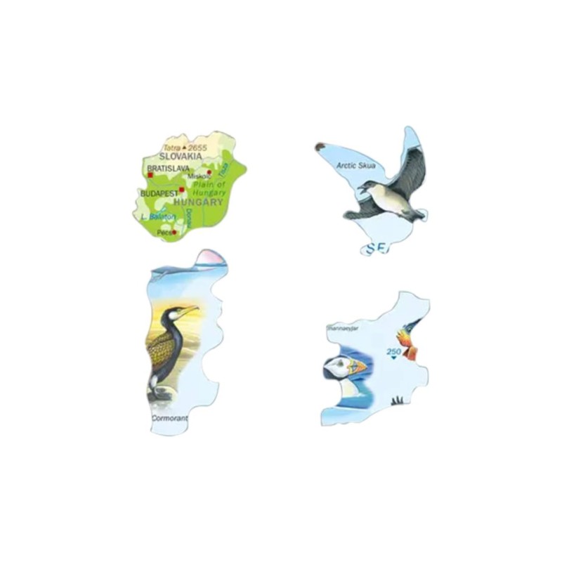 The pieces are cut along coastlines and land borders, and some of the pieces have shapes like fish, birds, whales and a polar bear.