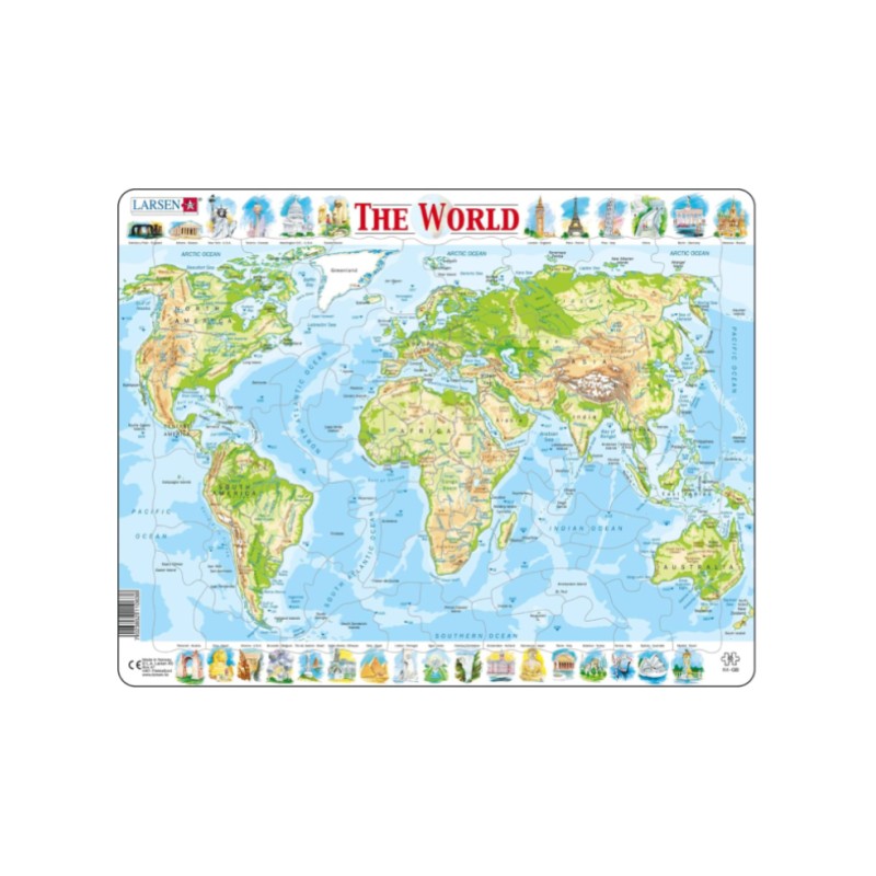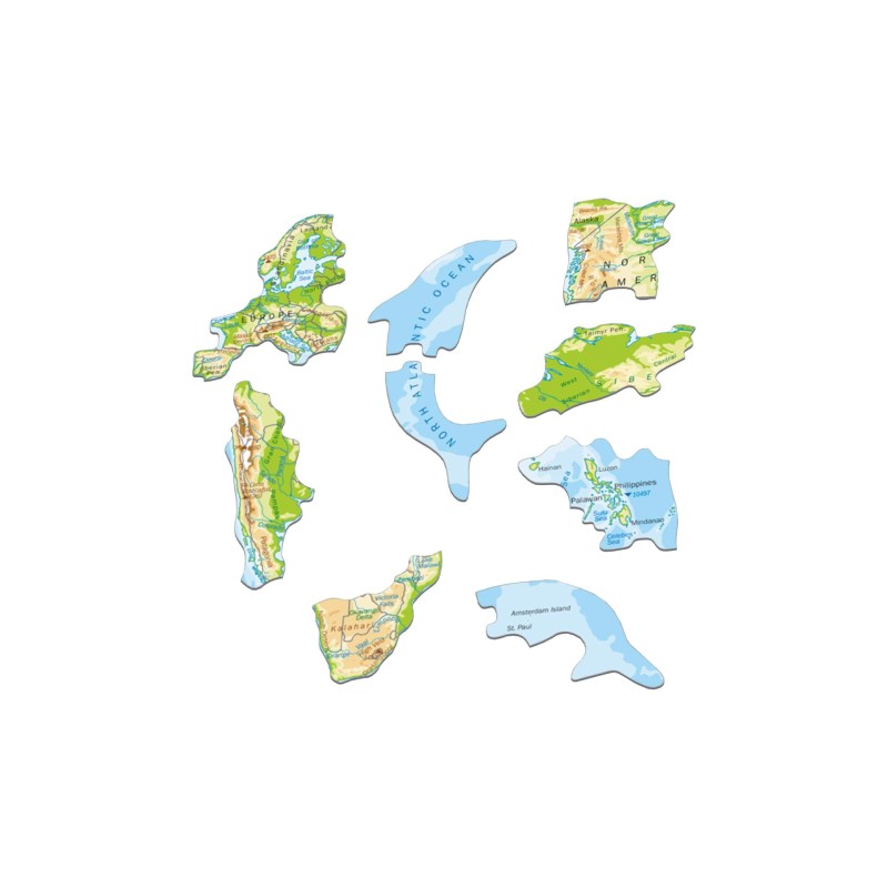 This physical world map puzzle features mountain ranges, deserts, great plains, islands, oceans, continents and countries.
