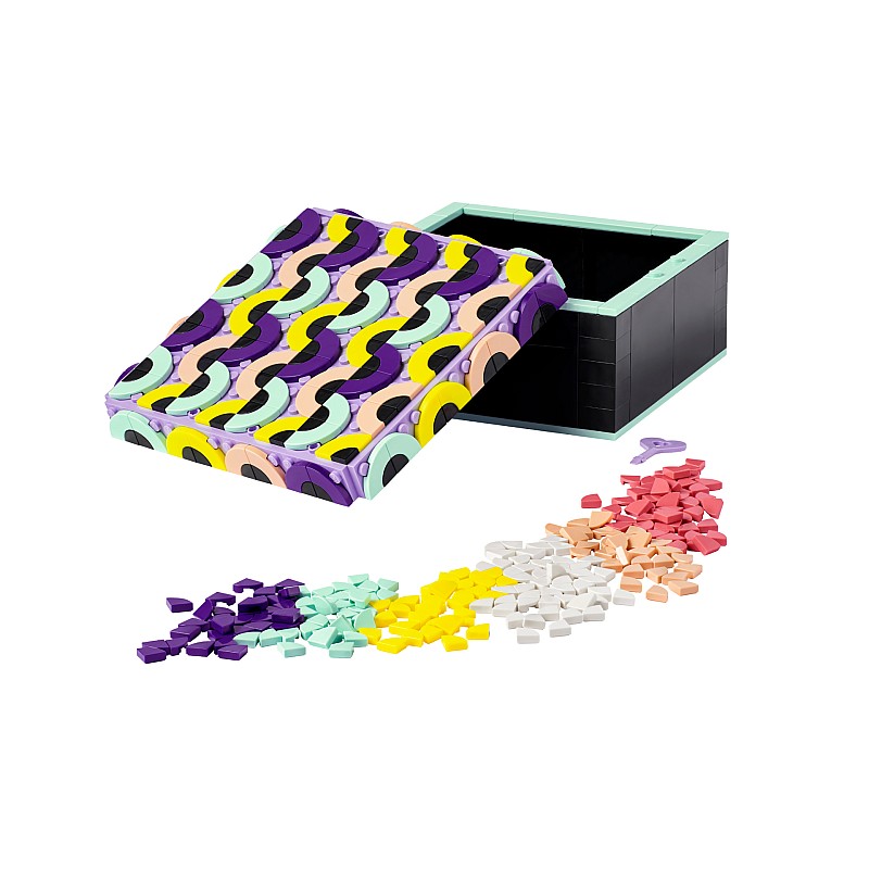 Kids can stimulate their imaginations and creative skills while playing with a set that includes a design-ready removable black box and lid, plus neon and pastel tiles.