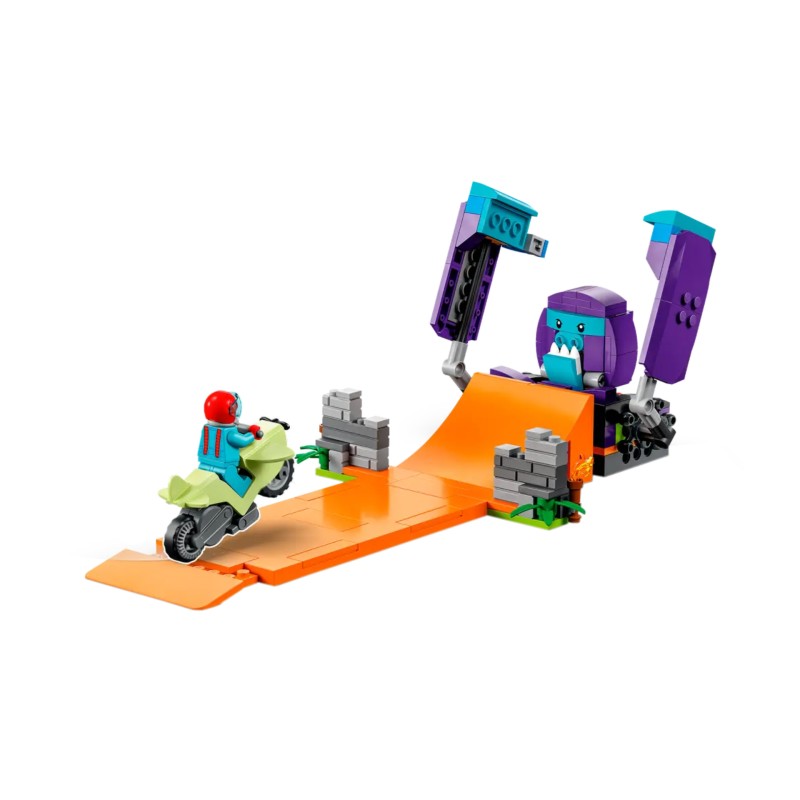 The LEGO City Smashing Chimpanzee Stunt Loop (60338) building set contains a mechanical chimpanzee stunt prop, a loop and ramp and a motorcycle.