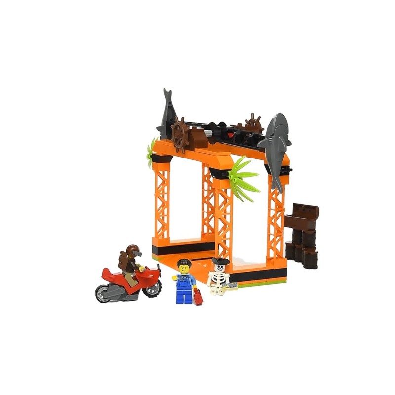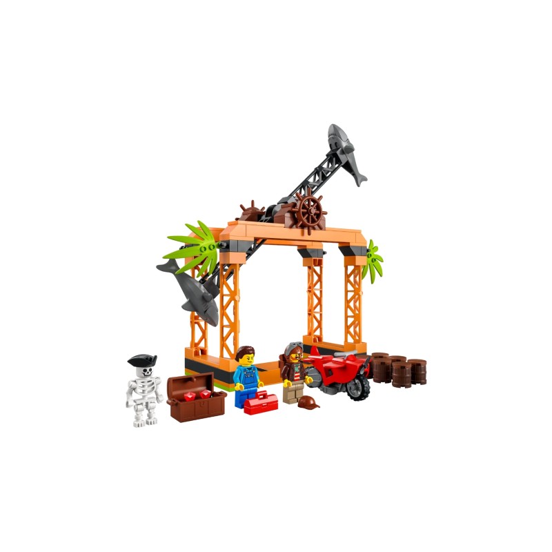 Get into the action with this LEGO City The Shark Attack Stunt Challenge (60342) set. Kids activate the steering motor and release it, avoiding the skeleton and the spinning shark wheel.