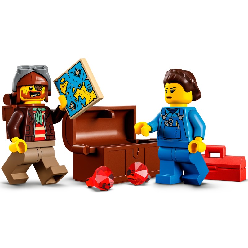 They knock through the barrels and discover the pirate's hidden treasure. Includes 2 minifigures, including Chuck D. Goldberg from the LEGO City TV series.