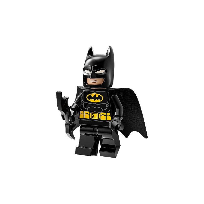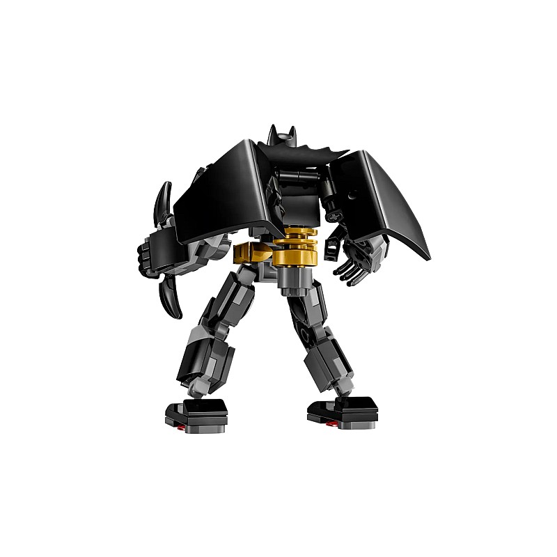 On his back he has a jetpack covered by a 2-part cape that can be moved to different positions. The minifigure wears a fabric cape and holds another Batarang, which can be stored on the mech's right arm.
