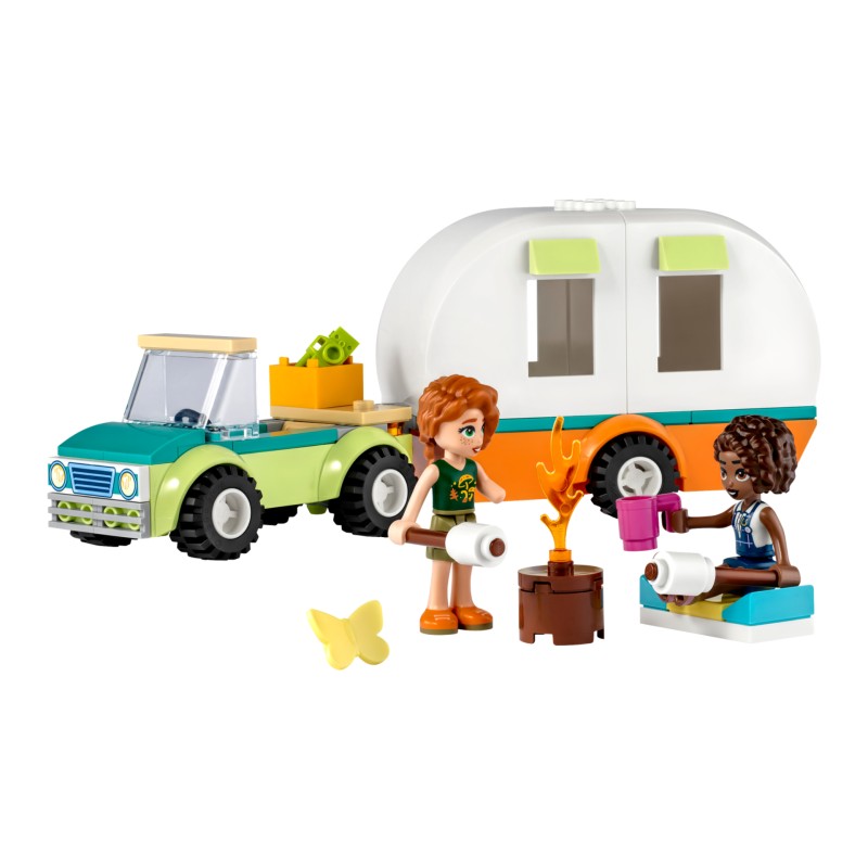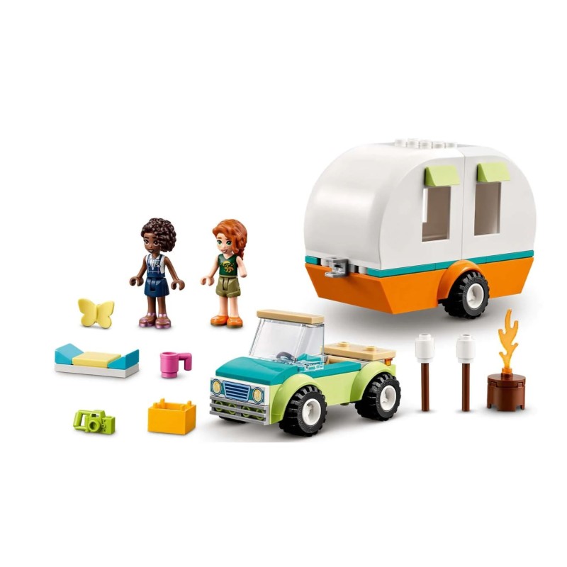 This set comes with Lego Friends Autumn and Aliya mini-dolls, plus accessories: a camera, butterfly, campfire and marshmallows.
