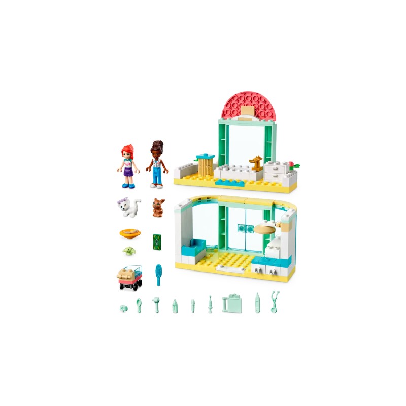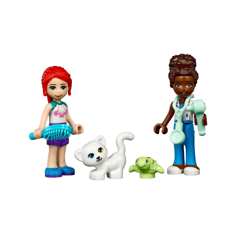 The toy comes with 2 mini-dolls, including LEGO Friends Mia and LEGO Friends Mia and cat, turtle and rabbit toys, plus lots of vet kits for kids to spark hours of grooming play.
