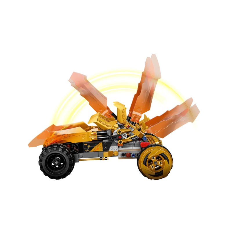 The ninja vehicle features impressive golden lightning blades that you can push forward for dragon attack mode, 2 stud shooters, 4 large tires and seats for a passenger and driver.