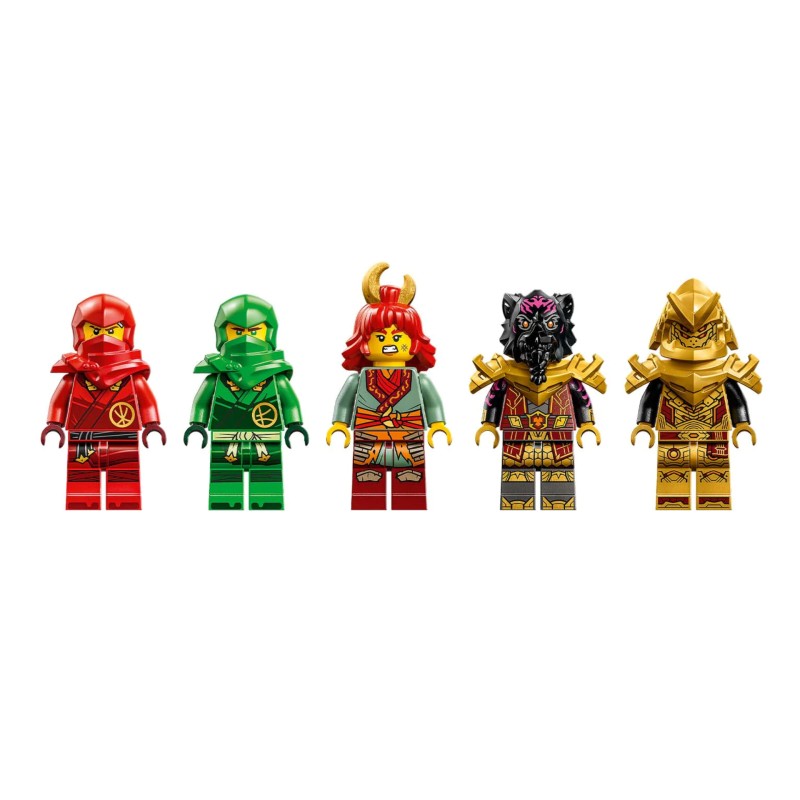 This ninja dragon playset comes with 5 minifigures: Kai and Lloyd, each armed with 2 katanas, Wyldfyre with her fireball fist, Imperium Claw Hunter with an Imperium sword, and Lord Ras with a golden hammer and a hovercraft of battle.