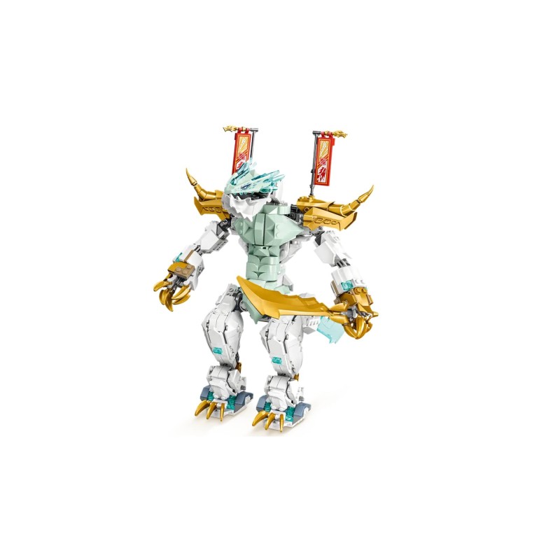 This 2-in-1 Ninjago model can be built into a 6-legged poseable ice dragon with long tail, horns and wings with golden blades and then rebuilt into a 2-legged poseable dragon warrior wielding a sword golden sea