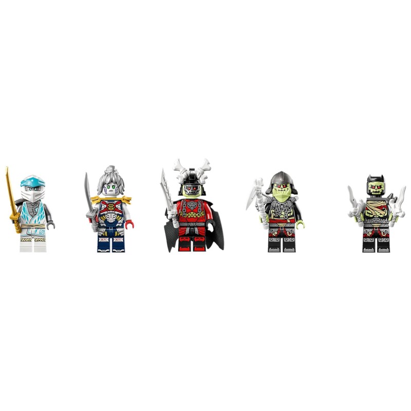 The building set comes with 5 minifigures: Zane, Pixal and each with a sword, to play battles against the villains Bone Knight, Bone Warrior and Bone King, who each have a weapon from the Green Bone Warriors weapon pack.