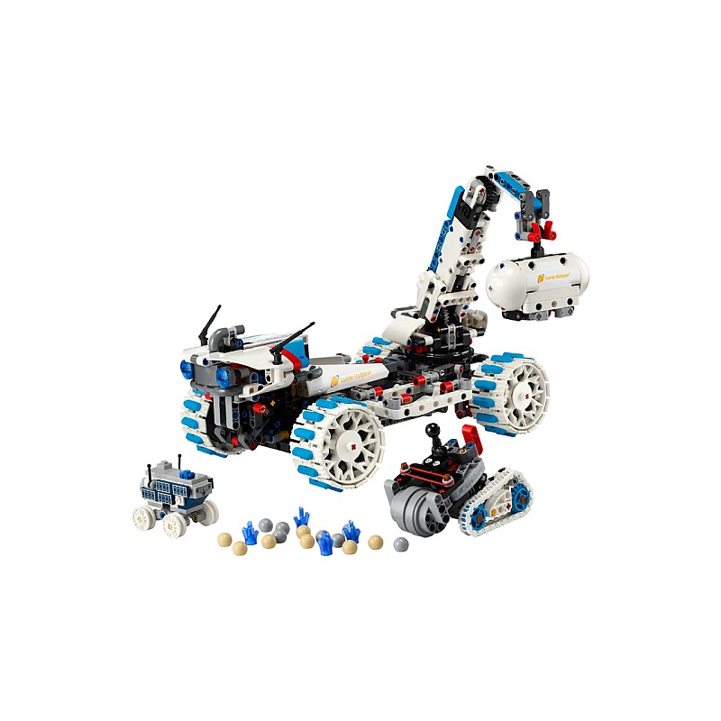 This set has a lot of features to stimulate creative stories. The main model is a futuristic monthly rover, for all types of land, with tilting suspension, 4 -wheel direction, solar panels and a rotary arm.