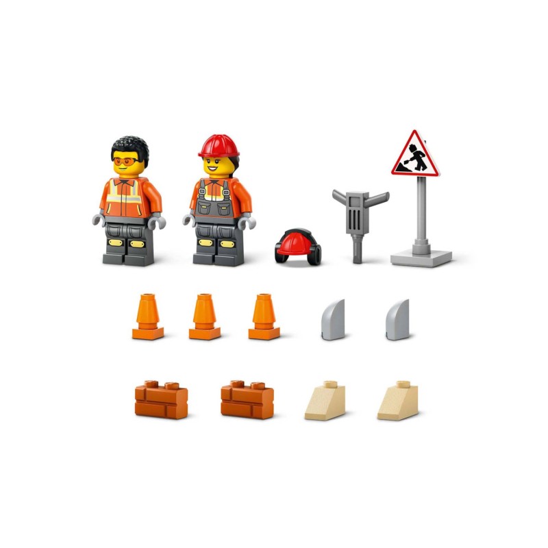 The set also includes a road indicator, traffic cones and a pneumatic toy hammer and comes with driver minifigurine and worker for imaginative and stories.