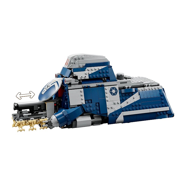 In the back is a compartment that houses a speeder master, ready to be carried out for fast missions or air fights. All these details make this MTT a central piece in any fighting scenario between the separatist armies and the forces of the Republic.
