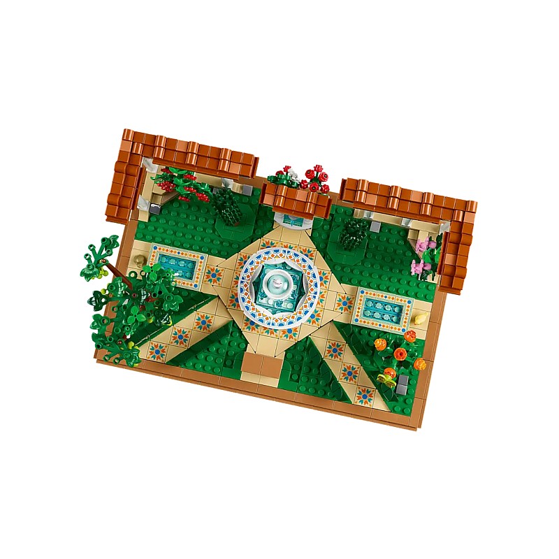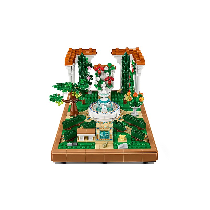 This set is part of the Lego Icons collection and allows the recreation of a beautiful park with a central fountain, surrounded by vegetation, banks and other decorative elements.