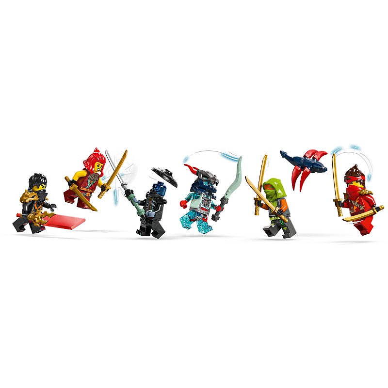 This set of LEGO vehicles contains 6 minifigurines: Kai, Wyldfyre and, for the first time, Frak, each with 2 golden accessories for Katana sword, Cole with a translucent accessory and Nokt and a spectral Dragonian scout.