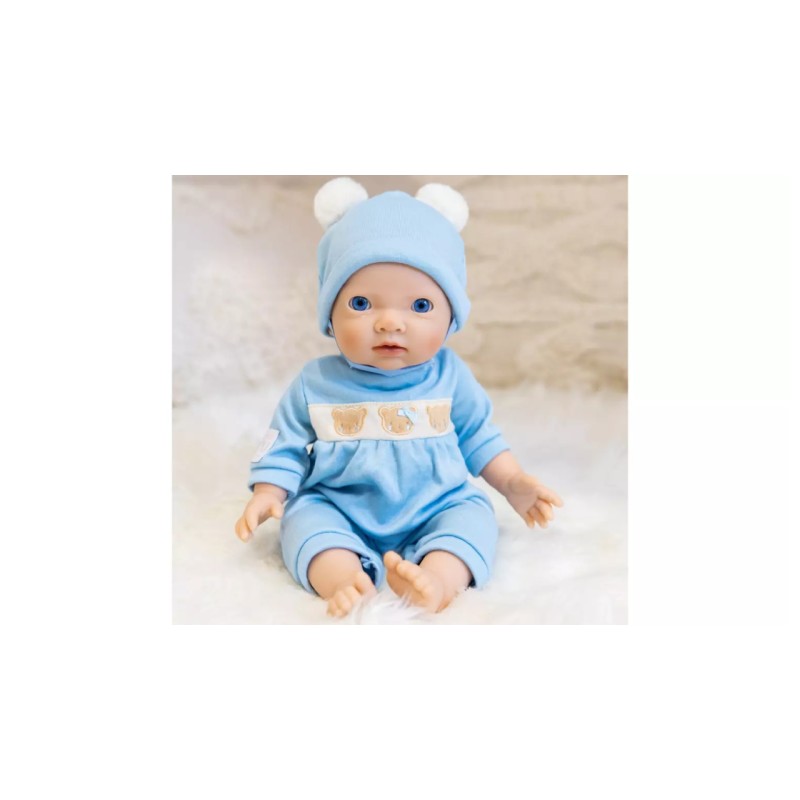 She wears a light blue all in one jumper with a peter pan collar and has a cream chest panel with 3 adorable teddy faces with blue cheek details and a blue ribbon bow. She also wears a matching blue jersey beanie with two cream pompoms.