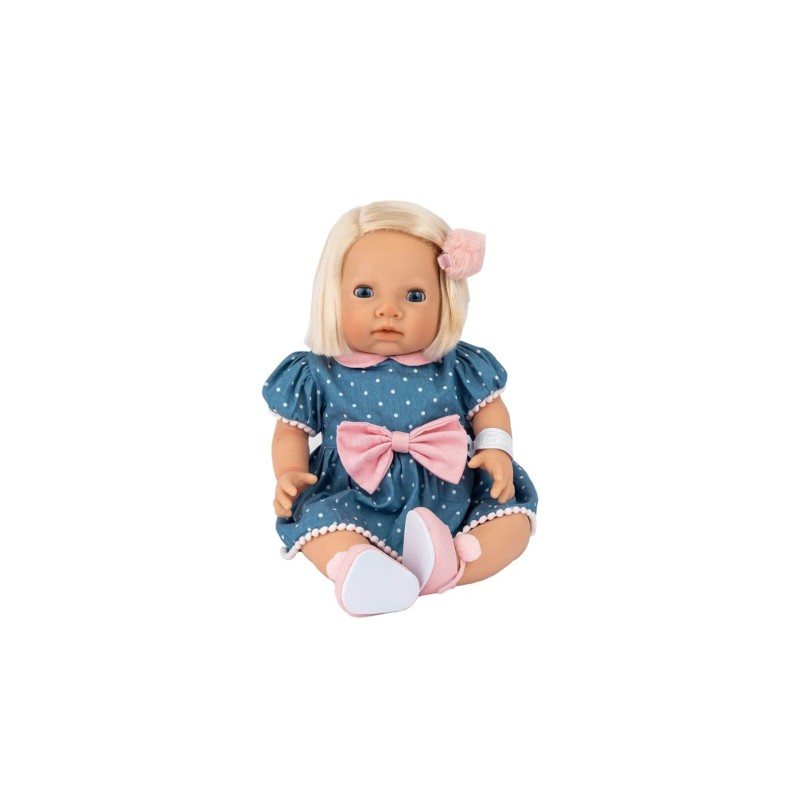 Cute Tiny Treasures doll wears a denim dress with pink polka dots, collar and bow.