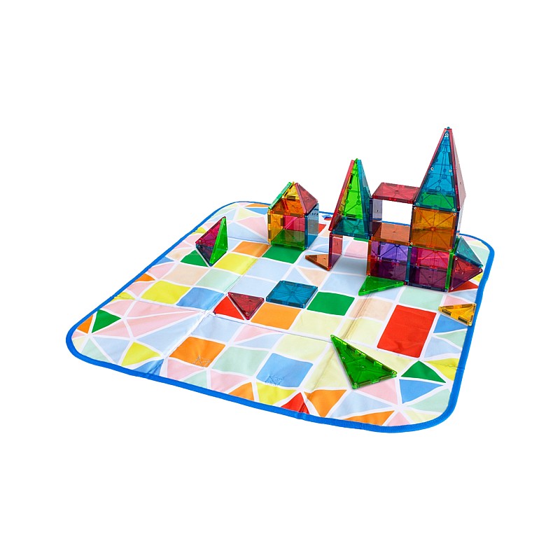 When extended as a play mat, it offers a stained glass-like aesthetic with the pastel hues of our vibrant magnetic Magna-Tiles shapes.