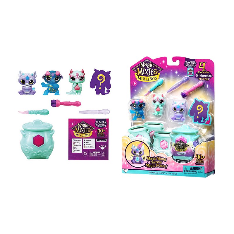 The Magic Mixlings Shimmer Mega Pack includes 3 Mixlings with an exclusive shimmer finish, plus 1 Mystery Shimmer Mixling in the included cauldron.