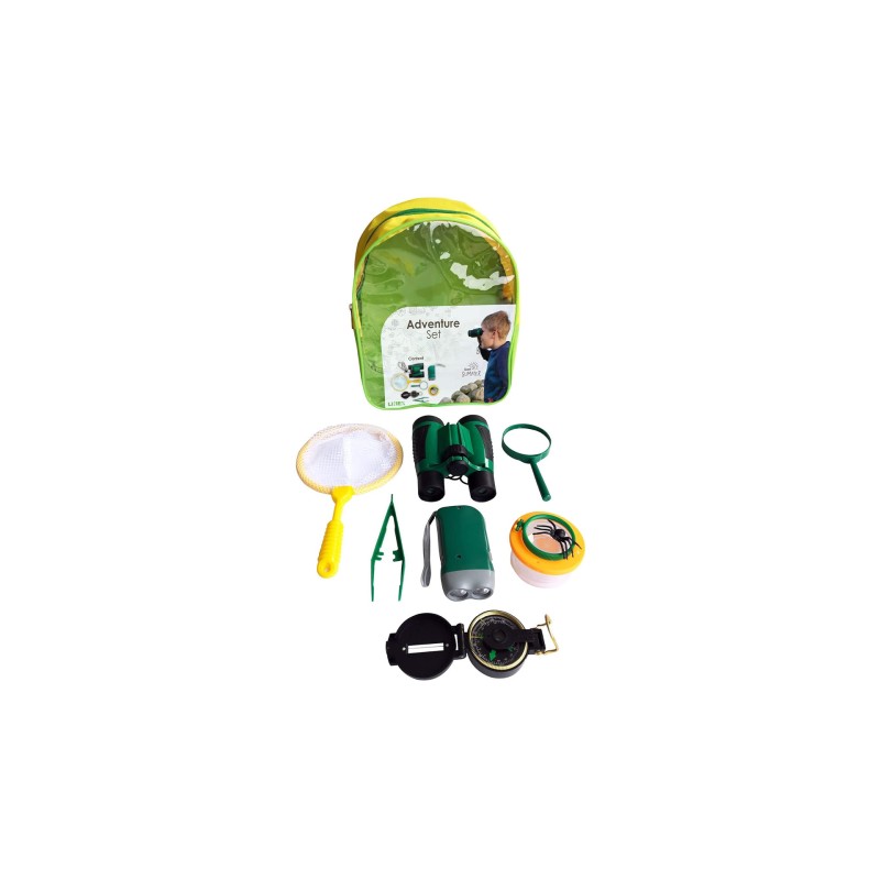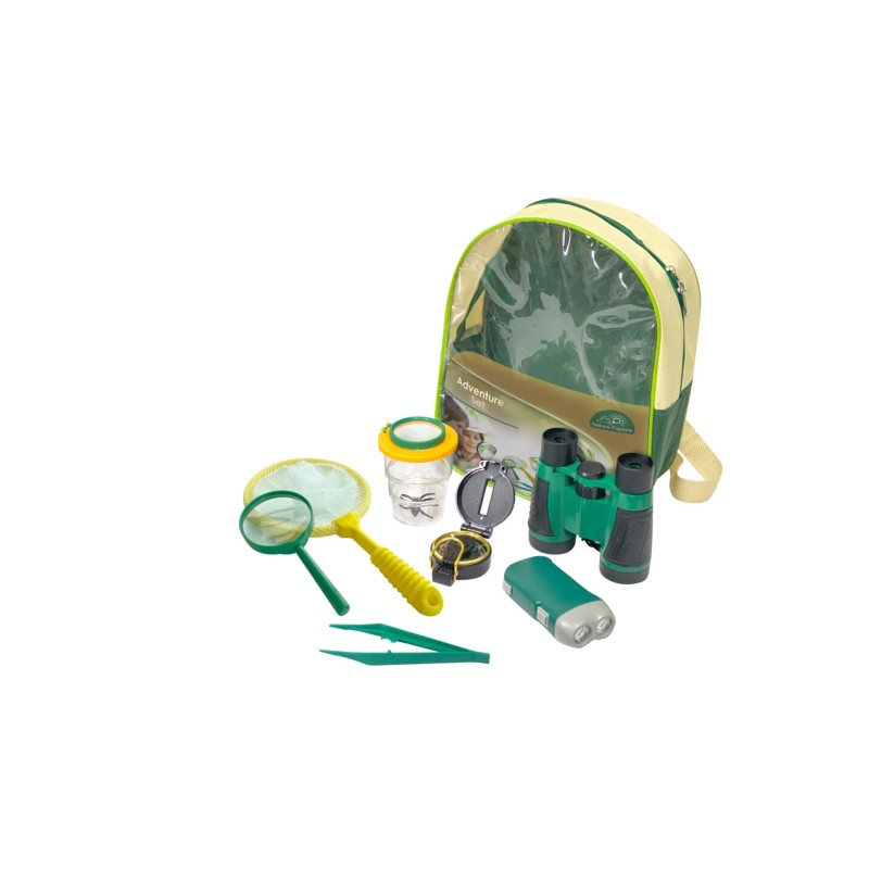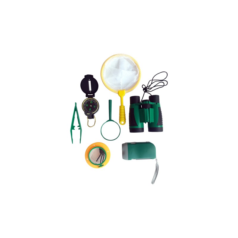 -Your Nature Kit includes: 1 x Backpack, 1 x Flashlight, 1 x Magnifier, 1 x Net, 1 x Binoculars, 1 x Compass, 1 x Tweezers, 1 x Container