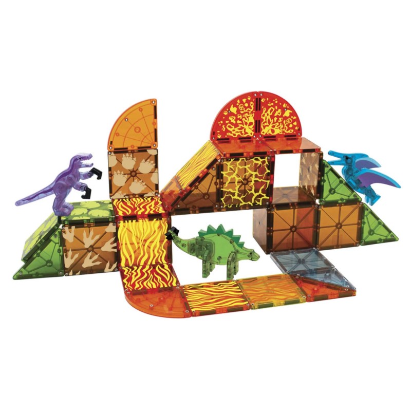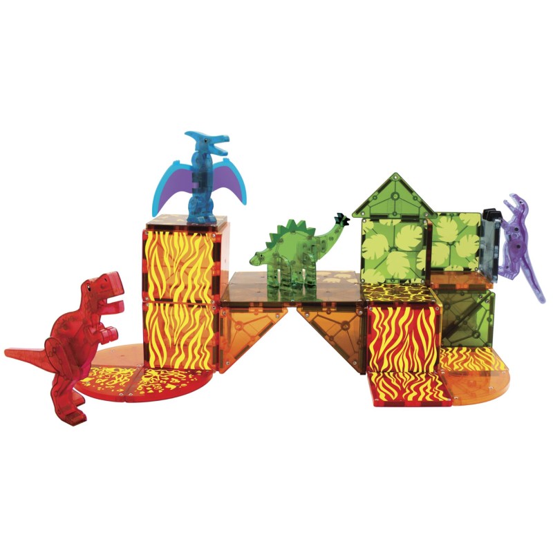 The Dino World set includes four oversized, fully magnetic dinosaurs and brightly colored, volcanic-themed tiles for endless play potential.