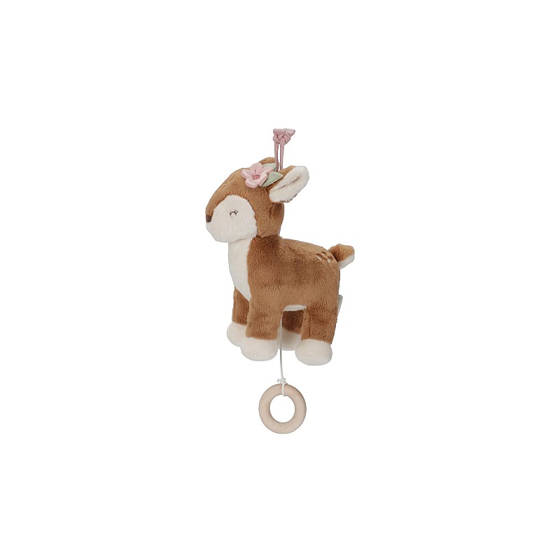 The music box is decorated with a cute deer and elements of the enchanted forest, including flowers and leaves, all in pleasant pastel colors.