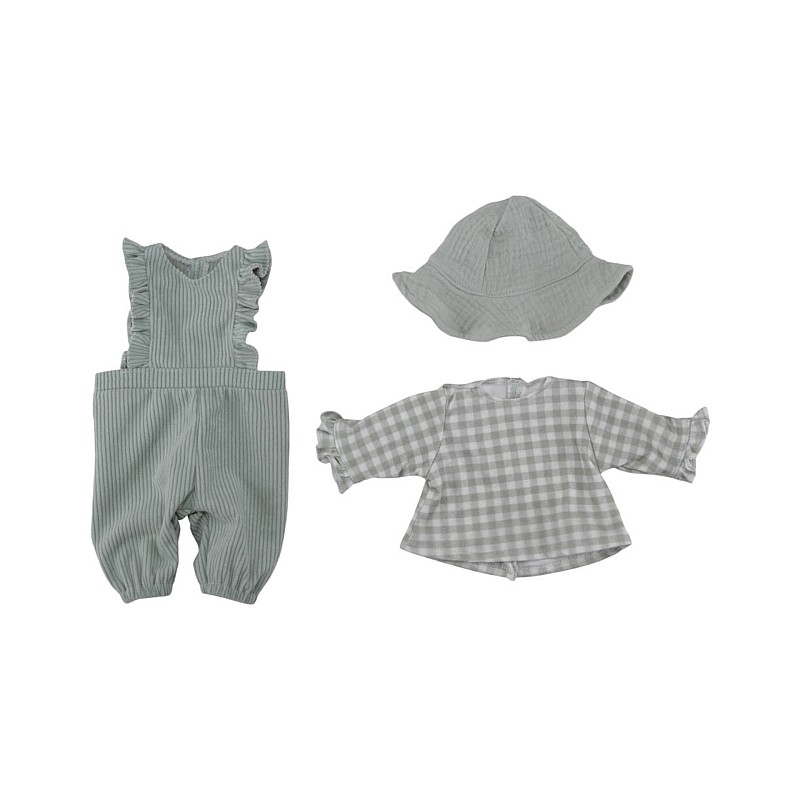 Jumpsuit with frills in a delicate shade of green, ideal to add a touch of elegance to the doll's wardrobe. Includes a green sun hat, perfect to complete the outfit.