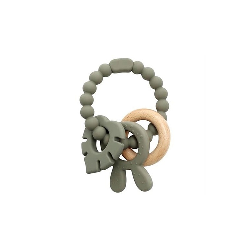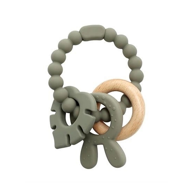 Discover the charm of the Magni Gray Leaf teething toy, expertly crafted from a blend of soft silicone and natural wood.