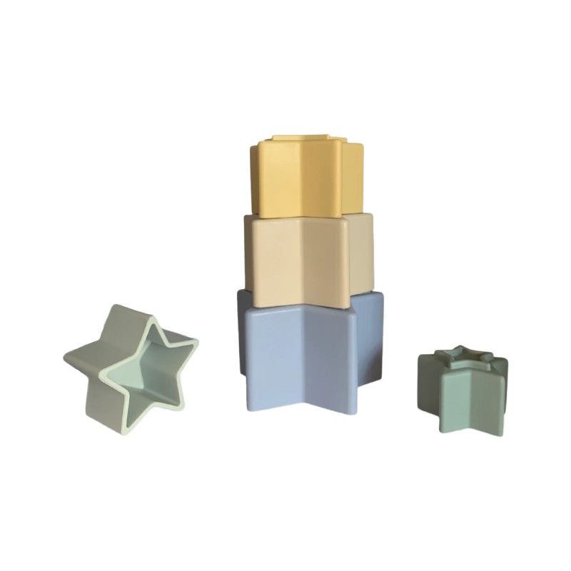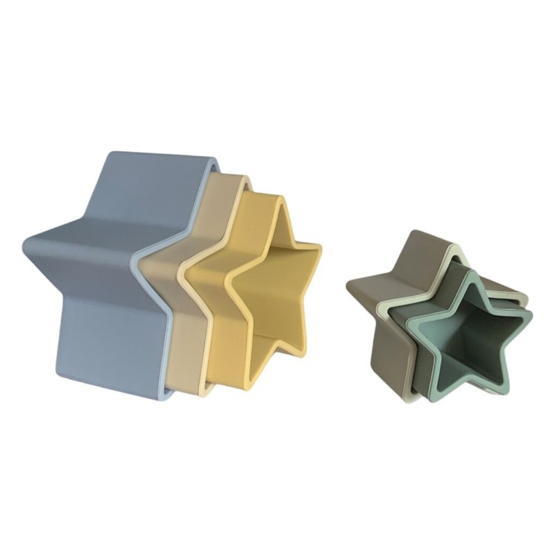 Stackable star-shaped silicone cups. The stackable stars are in fine, dusty colors and have a truly delightful quality.