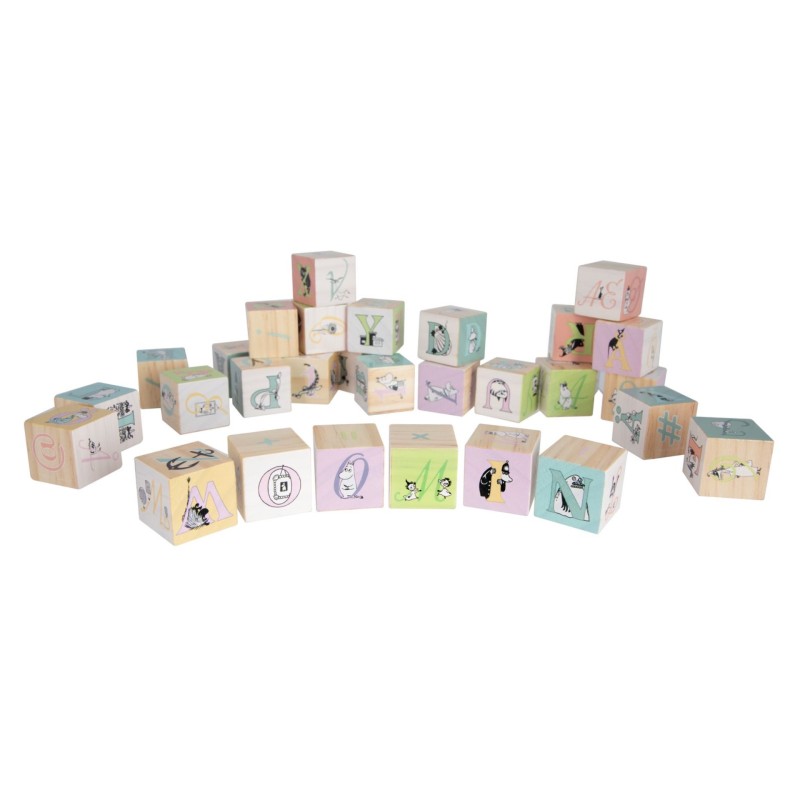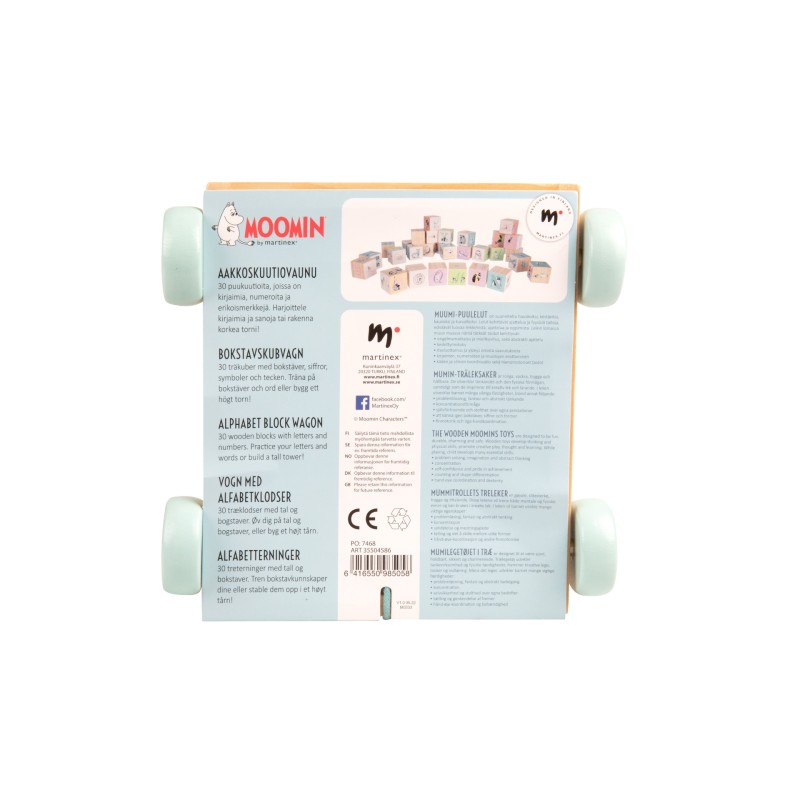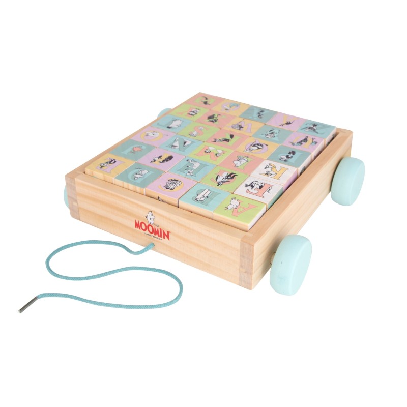 The trolley is filled with wooden cubes in pastel colors with the letters, numbers and signs of the alphabet, along with Moomin figures that climb, crawl and play with the letters.