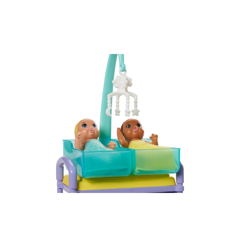 Play items include an examination table with a bottle of lotion and other accessories, an overhead mobile and see-through compartments for the 2 baby doll patients.
