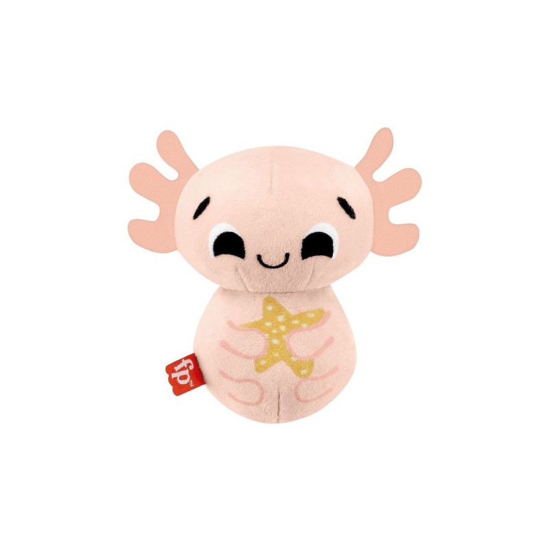 Plush axolotl has soft bells for auditory reward and cause and effect play.