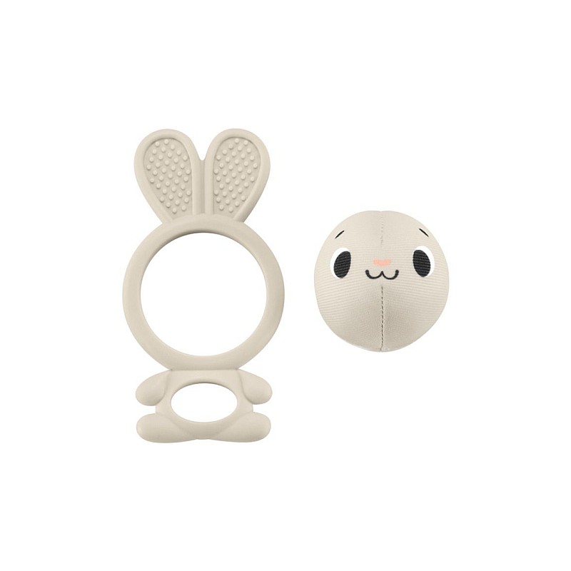 The BPA-free teething bunny has textured ears and a removable jingle ball for added fine motor play.