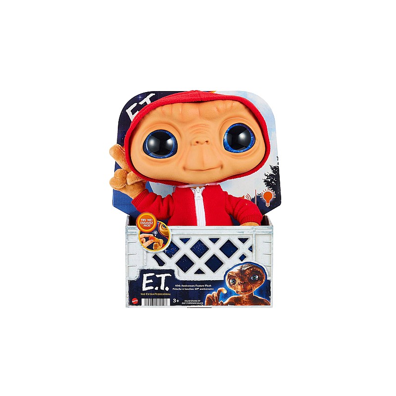 Celebrating the cinematic masterpiece E.T. The Extra-Terrestrial, this character E.T. plush, with sounds and a light-up finger, celebrate 40 years of over-the-moon adventures with the cute lost alien!