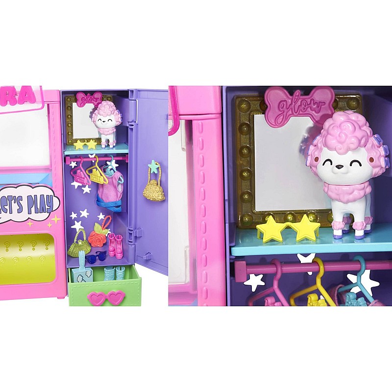 Designed in fun and bright colors, the playset opens to reveal a wardrobe with a styling and animal area.