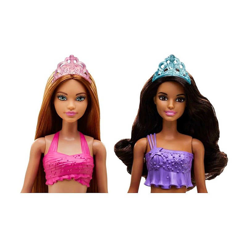 Play out the fun under the sea with this amazing set featuring two Barbie mermaid dolls, each with beautiful long hair and dressed in colorful mermaid tops and fins.