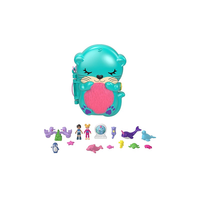 The compact Polly Pocket Otter Aquarium features an adorable otter design with a soft, plush belly on the outside and comes with Polly and Nicolas micro dolls.